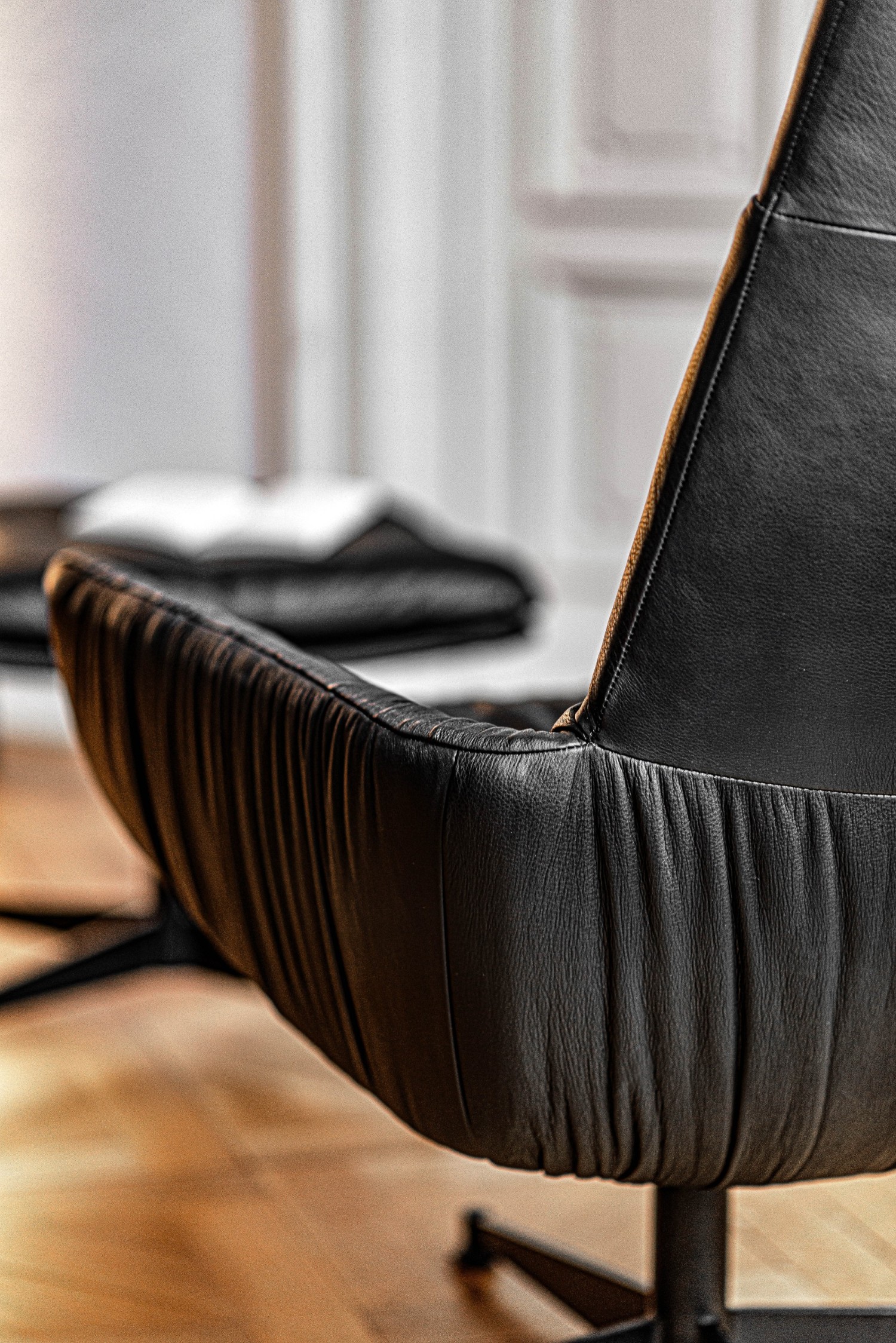 Passend zum Sessel zeichnet KFF einen leger gepolsterten, anschmiegsamen Pouf, der das Loungen noch komfortabler macht. Materialkontraste, die durch die individuelle Polsterung des Sessels etabliert wurden, können im Pouf fortgeführt werden.