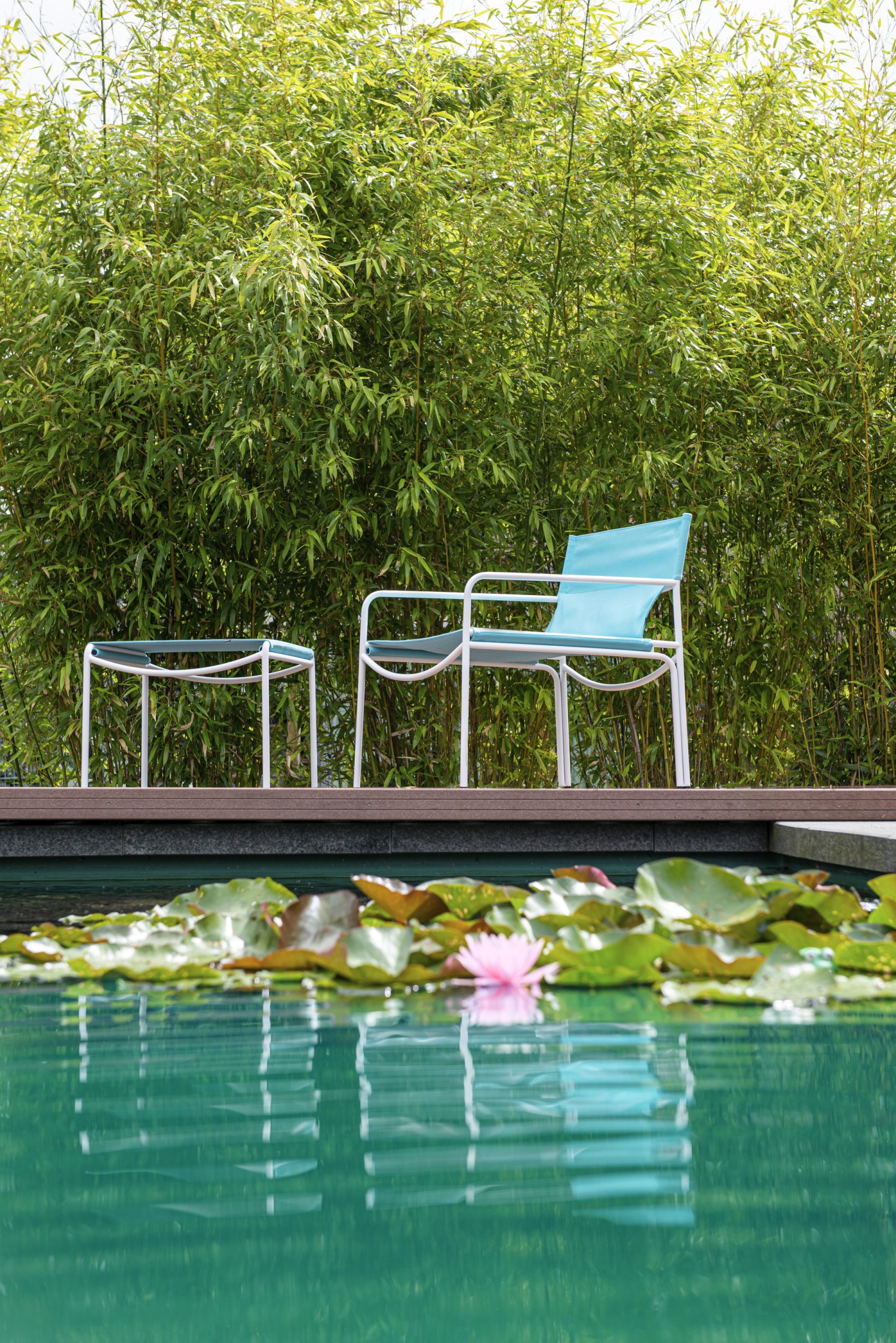Die minimalistische Outdoor-Kollektion des Newcomers Daniel Stegen erinnert an historische Regiestühle und ist in klaren, in sich geschwungenen Linien gezeichnet. Die Form des gesamten rostfreien Stahlgestells verläuft bewusst in Geraden und Kurven zu einer einmaligen Symbiose. Die waschbare, UV-beständige und wetterfeste Stoffbespannung im Rücken und Sitzbereich und das separate Kissen bieten höchsten Komfort. Als Stuhl oder als Loungesessel mit wandelbarer Ottomane bietet die POOL Familie Design und Komfort für den Outdoor-Bereich. Die Polsterhusse Comfort, ein kleines Board für den Armlehnbereich oder ein Tablett für die wandelbare Ottomane dürfen für noch mehr Gemütlichkeit und Funktionalität hinzugewählt werden. Die Farbauswahl der Stahl-Pulverbeschichtung und des Bezugsstoffes lassen Gestaltungsspielraum. POOL OUTDOOR erfrischend jung.