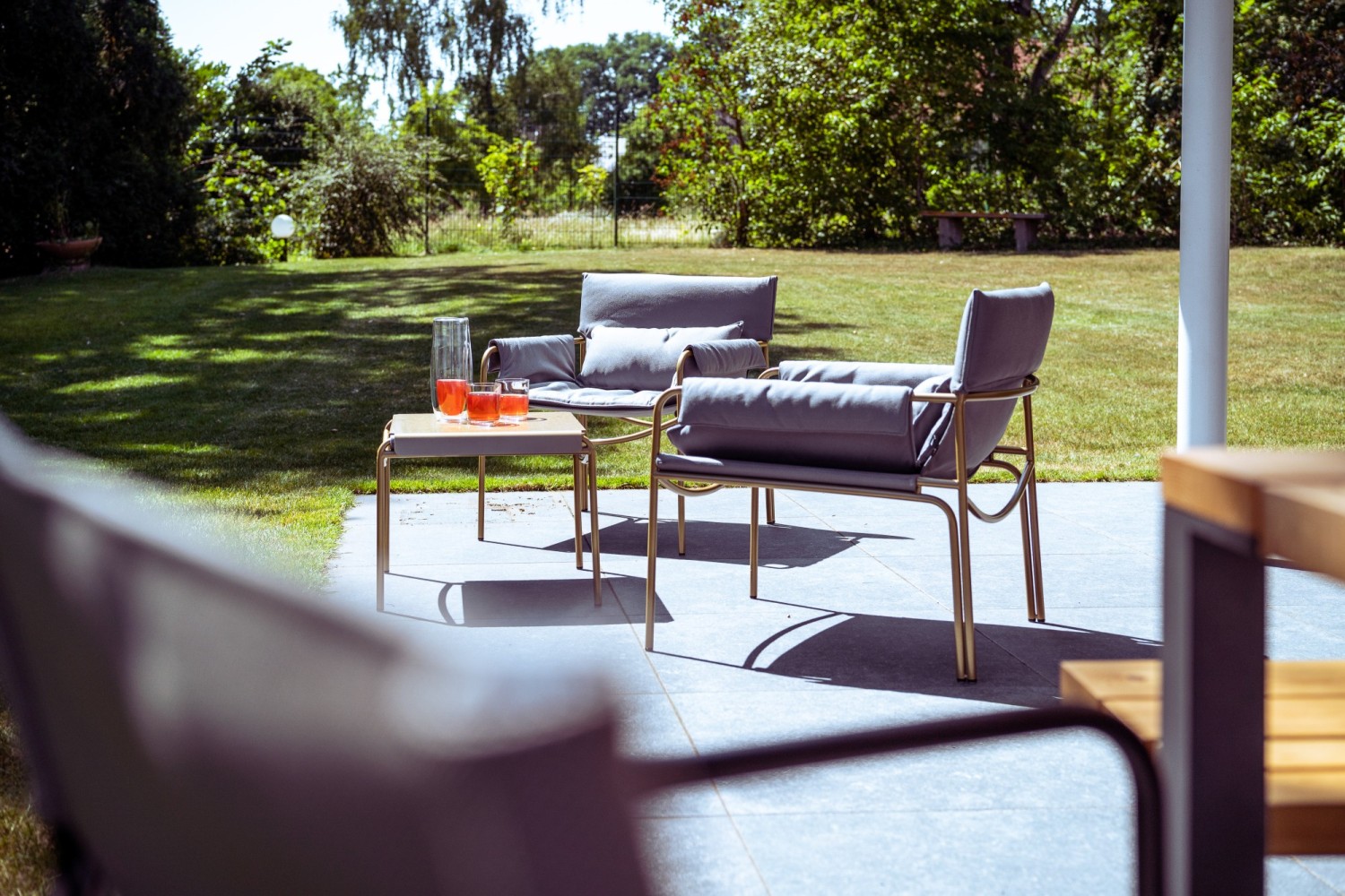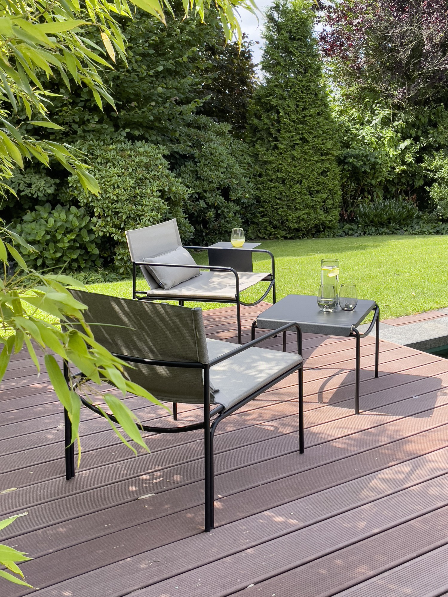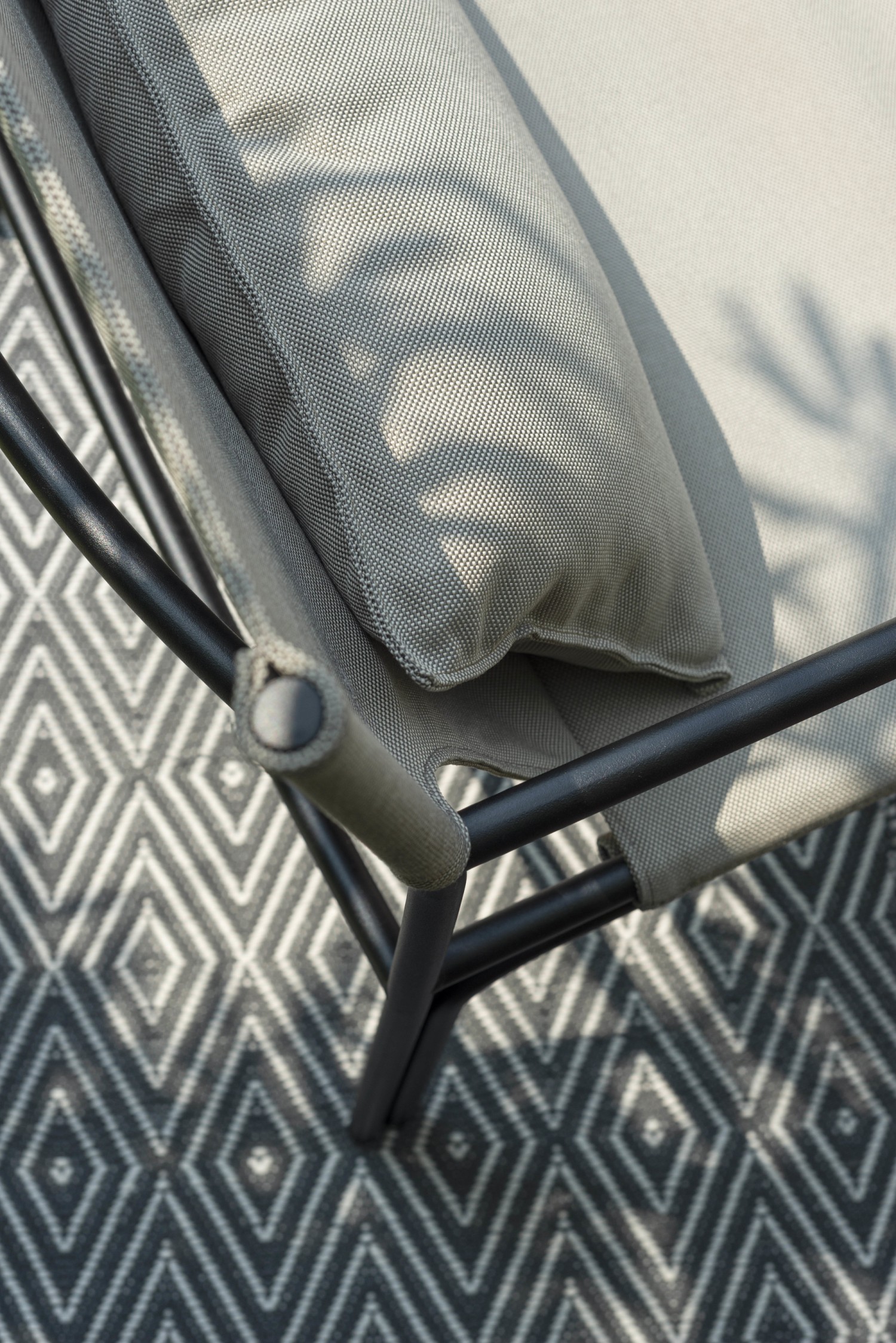 Das variable kleine Tablett aus pulverbeschichteten rostfreiem Stahl wird im Armlehnbereich eingehängt, kann die Seite wechseln, drinks & more parat stellen oder zum Beispiel beim Telefonieren als zusätzliche bequeme Armstütze dienen. Einfach erfrischend cool.