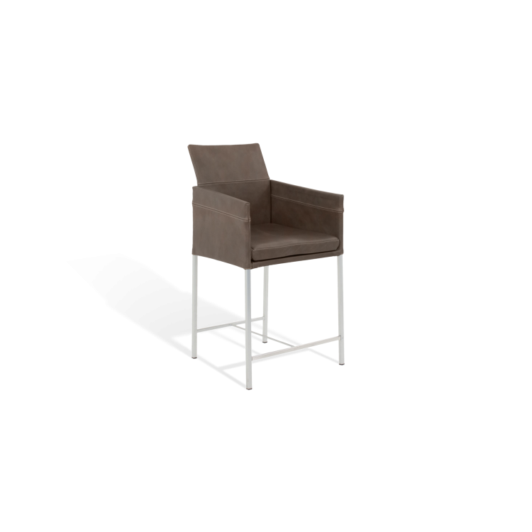 Die geradlinige Form und der Einklang aus Eleganz, Modernität und Zeitlosigkeit beschreiben das Design dieses unverwechselbaren Thekenstuhls. Die leicht geneigte Rückenlehne und eine mit Schaum bespannte Sitzfläche werden mit einer Husse aus hochwertigem Bezugsstoff oder robustem Leder überzogen. Das flache Schaumkissen sorgt für zusätzlichen Komfort. So anmutig und gemütlich wie ein schlanker Sessel auf hohen Beinen ist die TEXAS FLAT Komposition mit eleganter Armlehne. Der TEXAS FLAT, ein persönlicher Begleiter für die private Küchentheke oder für den Einsatz in der gehobenen Gastronomie.