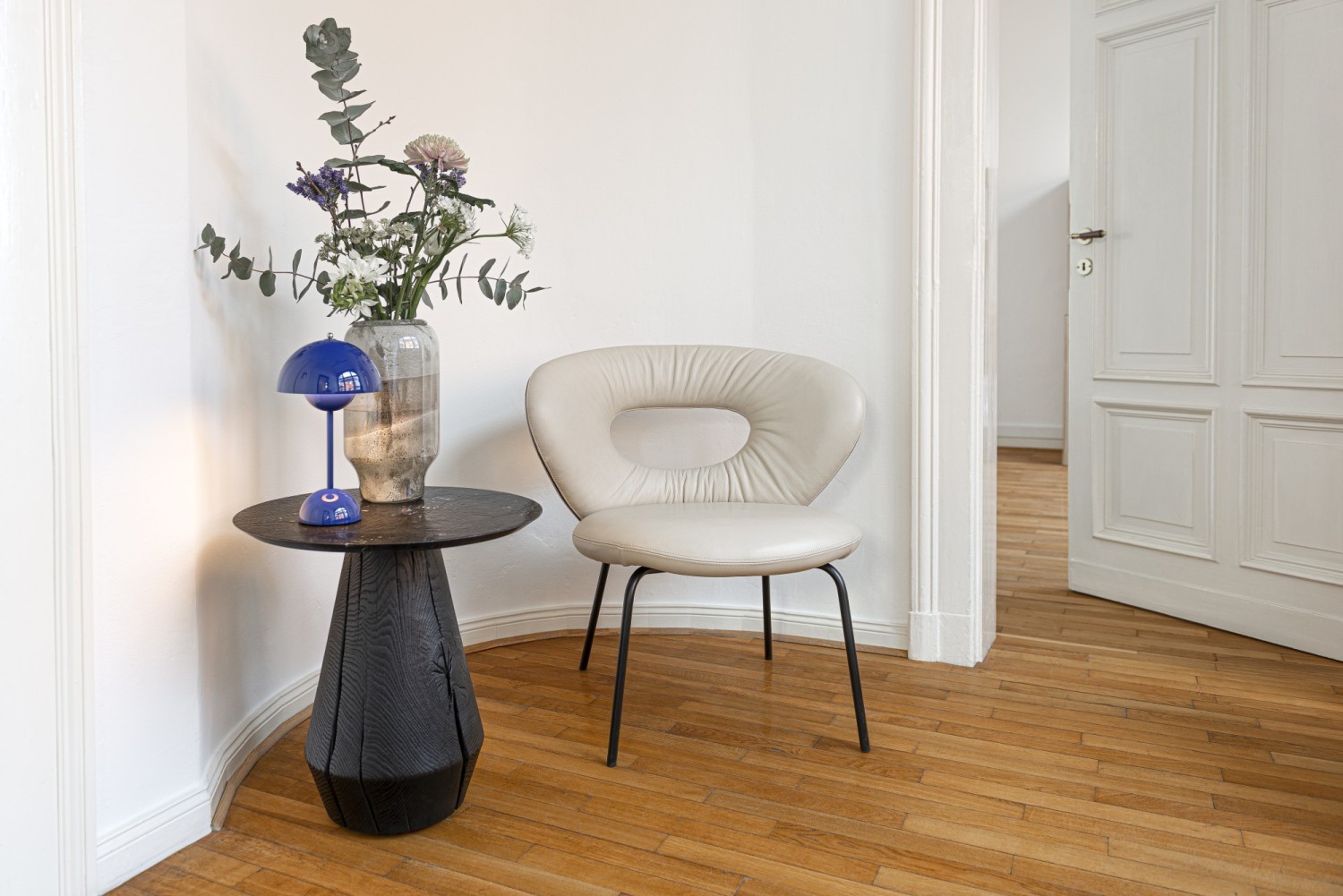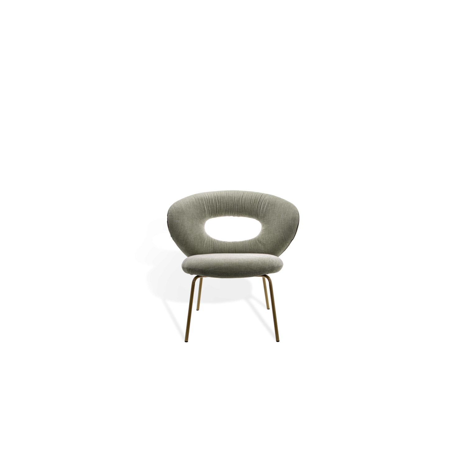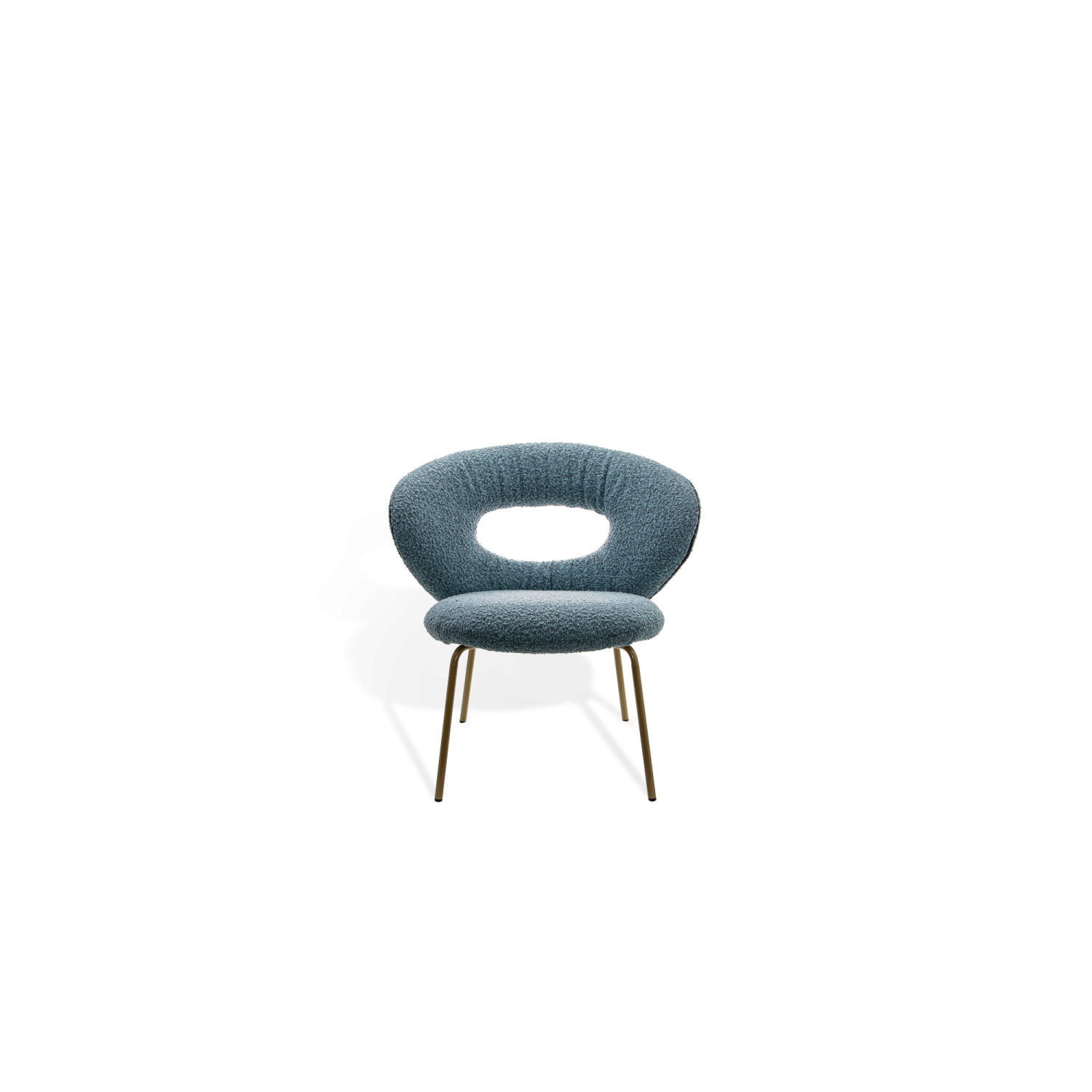 The pronounced, form-giving curves of the elliptical backrest and the characterful transparency are characteristic of Monica Armani's design. An elegant armchair facing us with the best comfort thanks to the dynamic, embracing back and an excellently upholstered seat. The contrasting band emphasises the design lines. Thanks to the oval opening in the backrest, incorporated with attention to detail, the furniture offers wonderful views in and out, is light and therefore easy to move. ALICE LOUNGE, a gem with comfort.