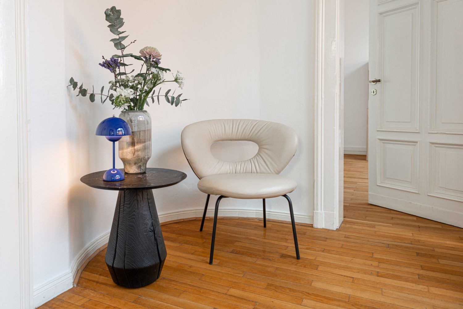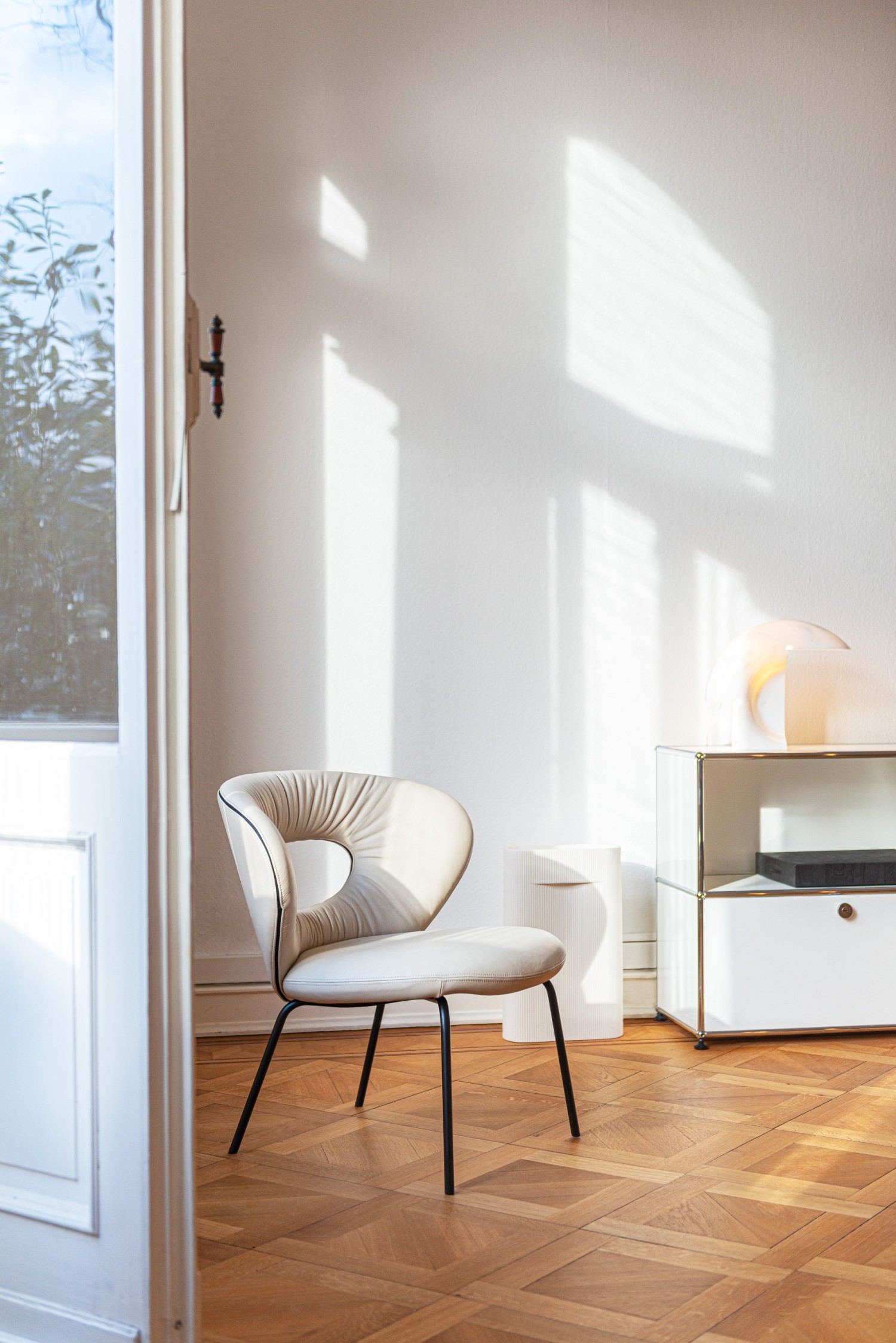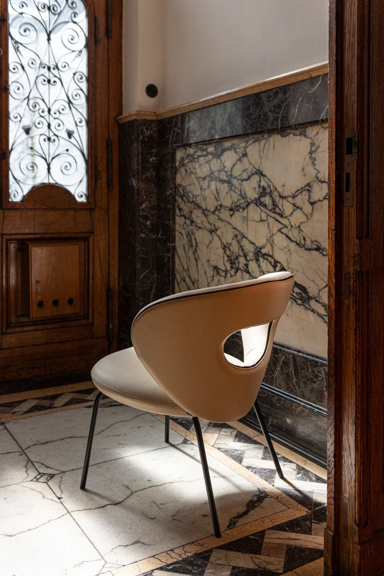 The pronounced, form-giving curves of the elliptical backrest and the characterful transparency are characteristic of Monica Armani's design. An elegant armchair facing us with the best comfort thanks to the dynamic, embracing back and an excellently upholstered seat. The contrasting band emphasises the design lines. Thanks to the oval opening in the backrest, incorporated with attention to detail, the furniture offers wonderful views in and out, is light and therefore easy to move. ALICE LOUNGE, a gem with comfort.
