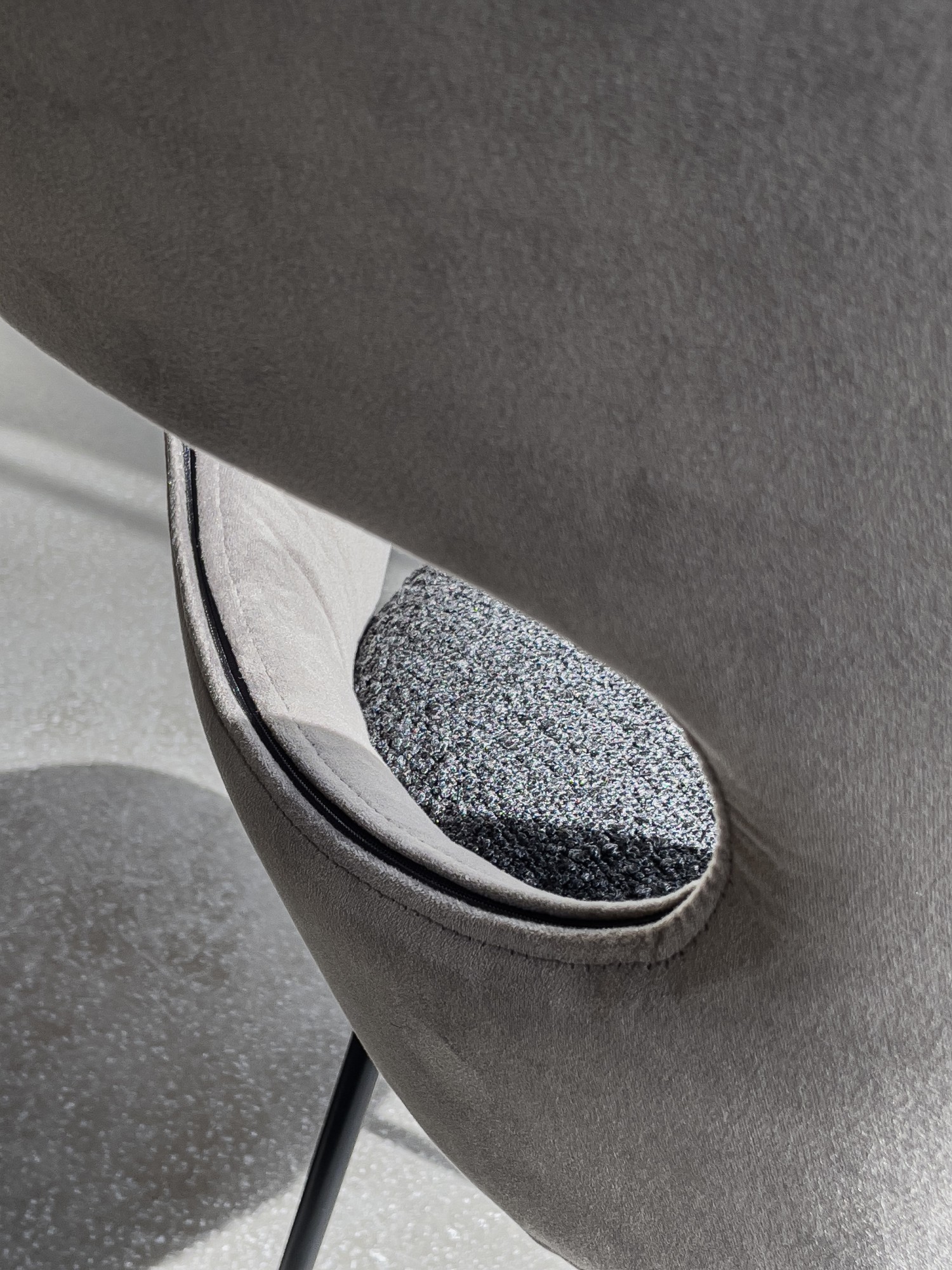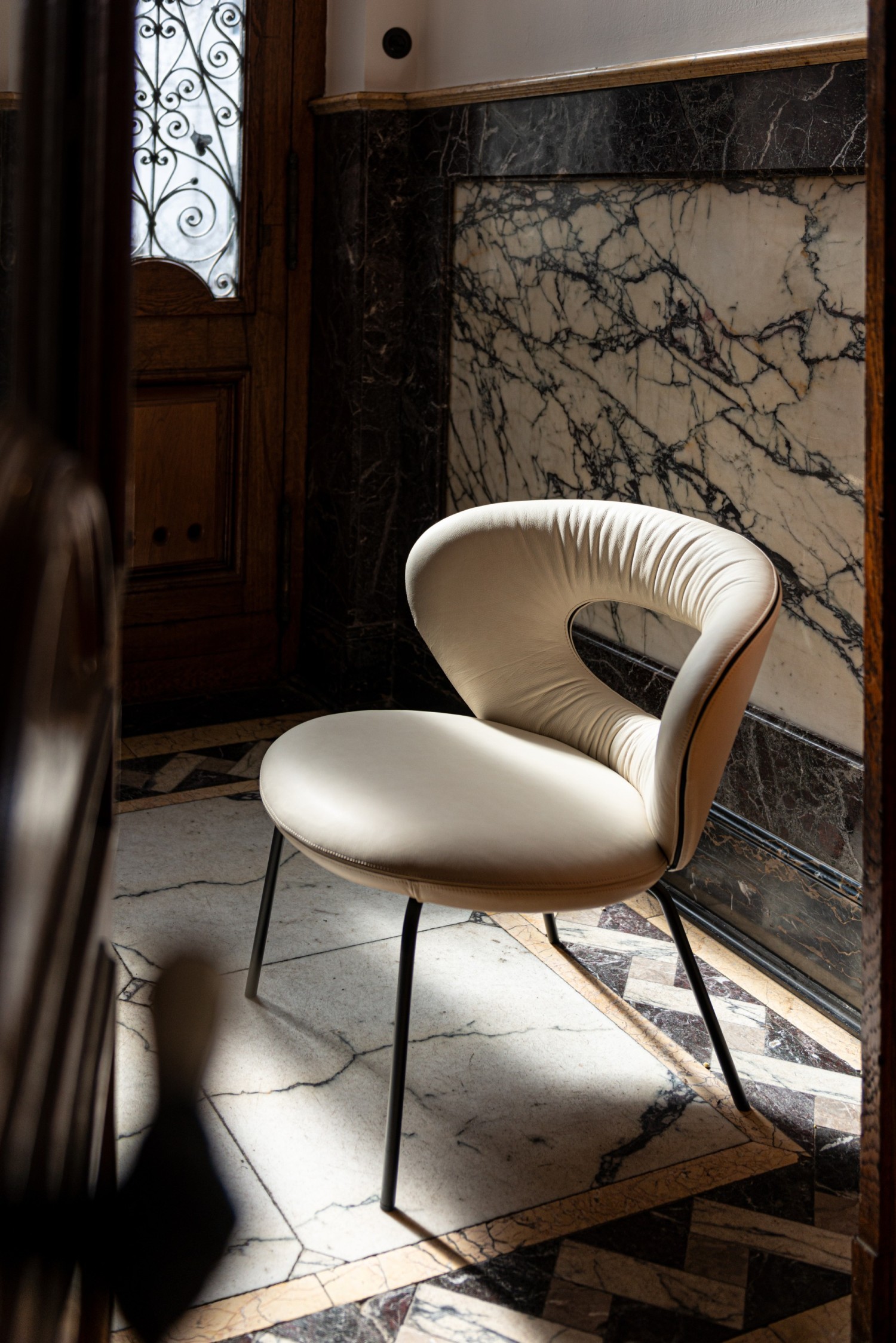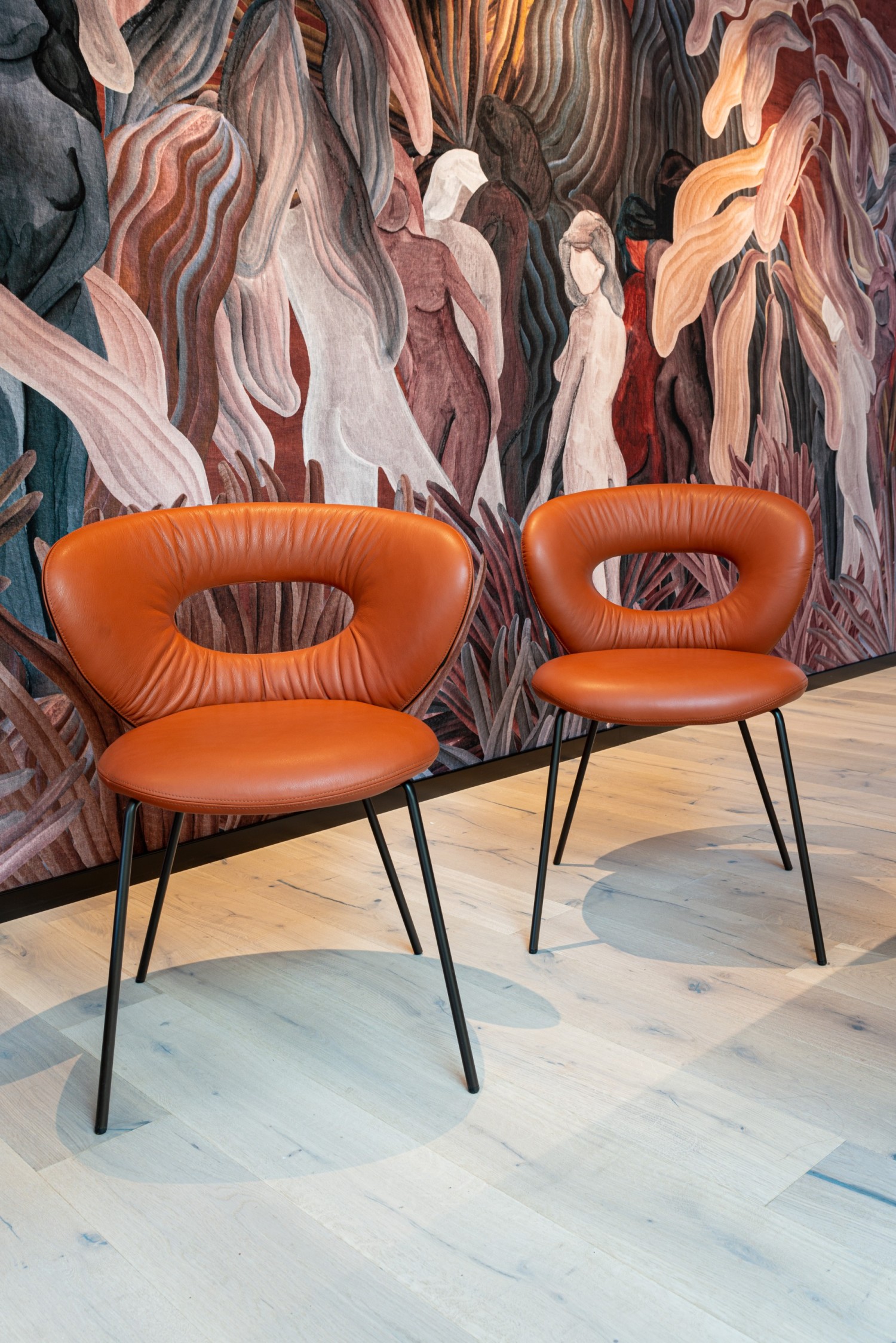 Monica Armani's first design concept always applies to the basic chair model. The pronounced, form-giving curves of the elliptical backrest and the characterful see-through are characteristic of the entire ALICE product family. An elegant piece of furniture facing us with the best comfort thanks to the dynamic, embracing back and an excellently upholstered seat. The contrasting band emphasises the design lines. Through the oval opening in the backrest, worked in with attention to detail, the furniture offers wonderful views in and out. Chair and counter chair, each available in two sizes for the back, and an armchair with ottoman for the lounge area, together form the strong character family. ALICE, three heights offer the best comfort and give us that special view for new perspectives. Story Monica Armani