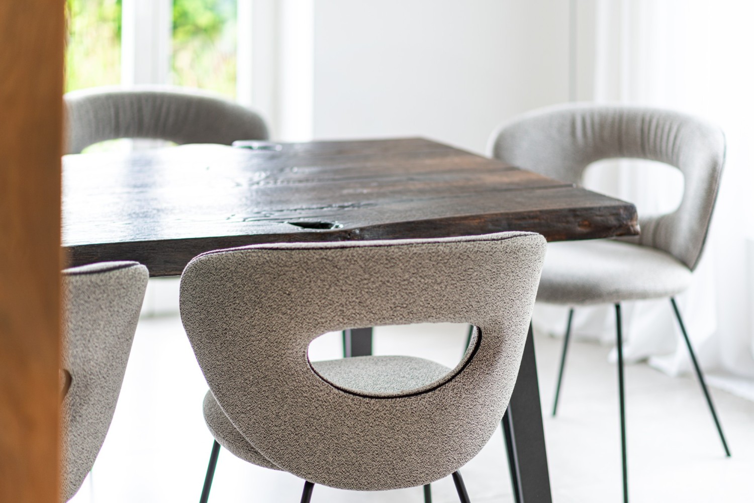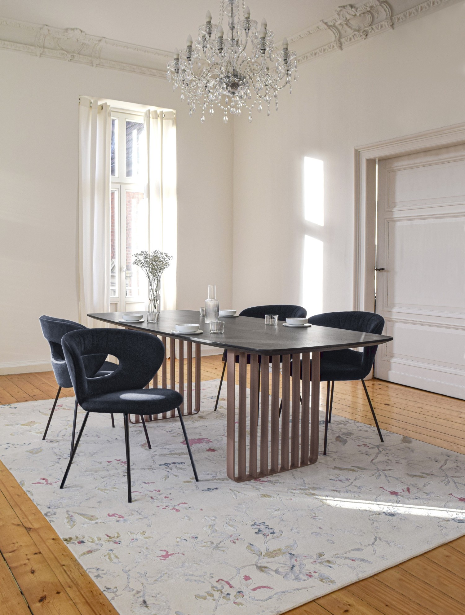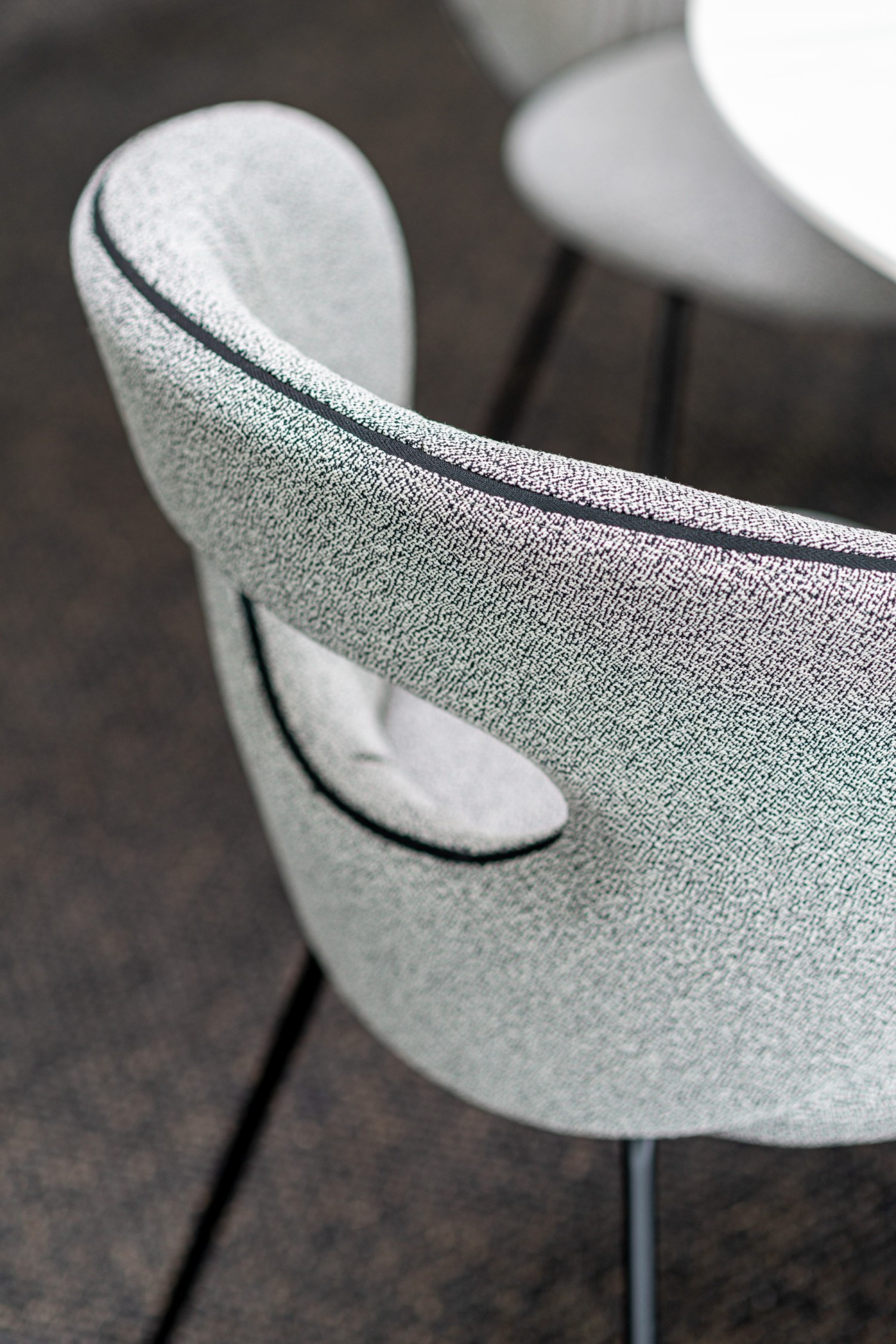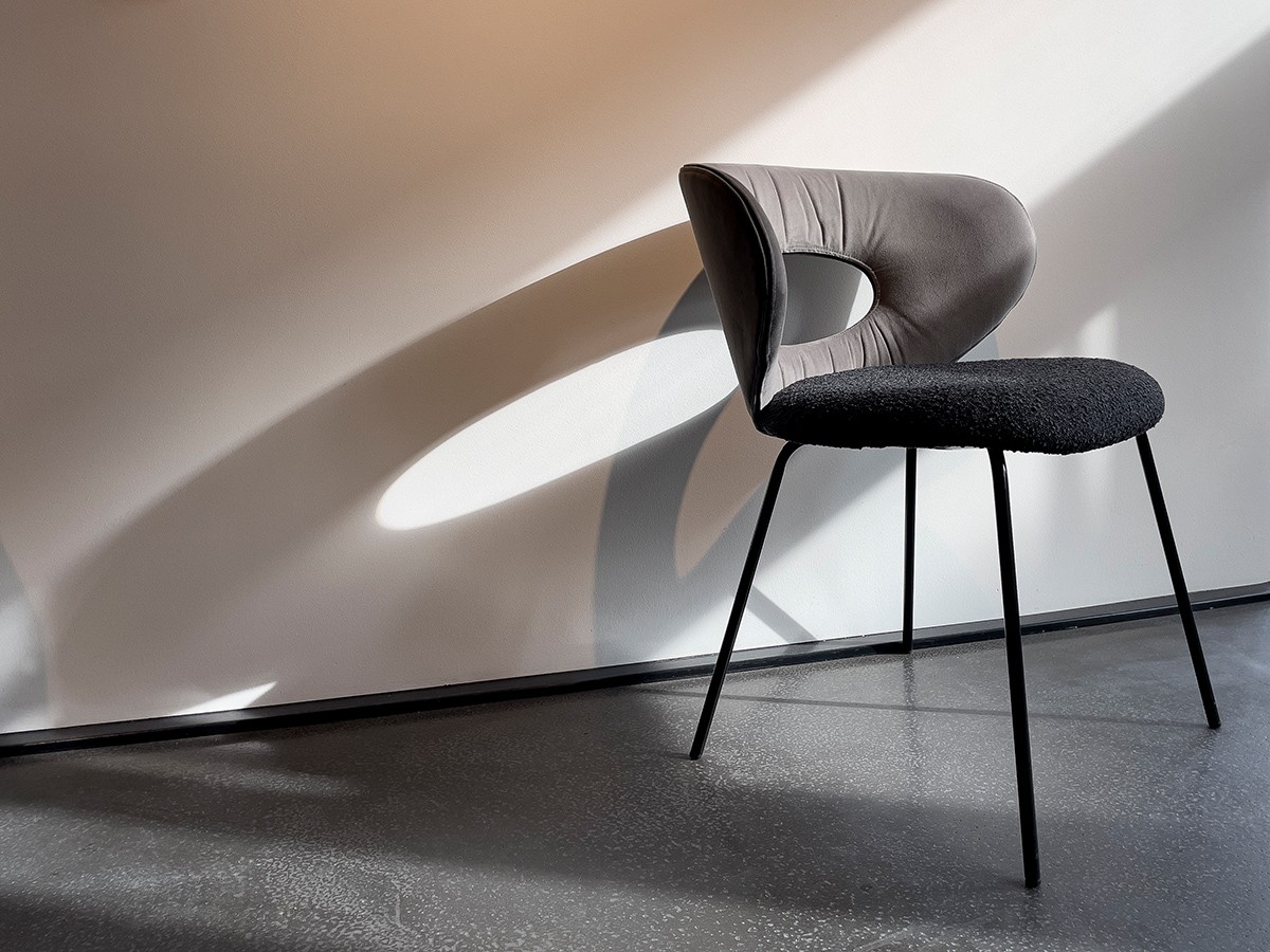 The pronounced, form-giving curves of the elliptical backrest and the characterful see-through are characteristic of the new design by Monica Armani. An elegant chair facing us with the best comfort thanks to the dynamic, embracing back in two size versions and an excellently upholstered seat. The contrasting band emphasises the design lines. Thanks to the oval opening in the backrest, incorporated with attention to detail, the furniture offers beautiful views from every perspective. On top of that, the chair is very light and easy to move. ALICE, a gem with comfort.