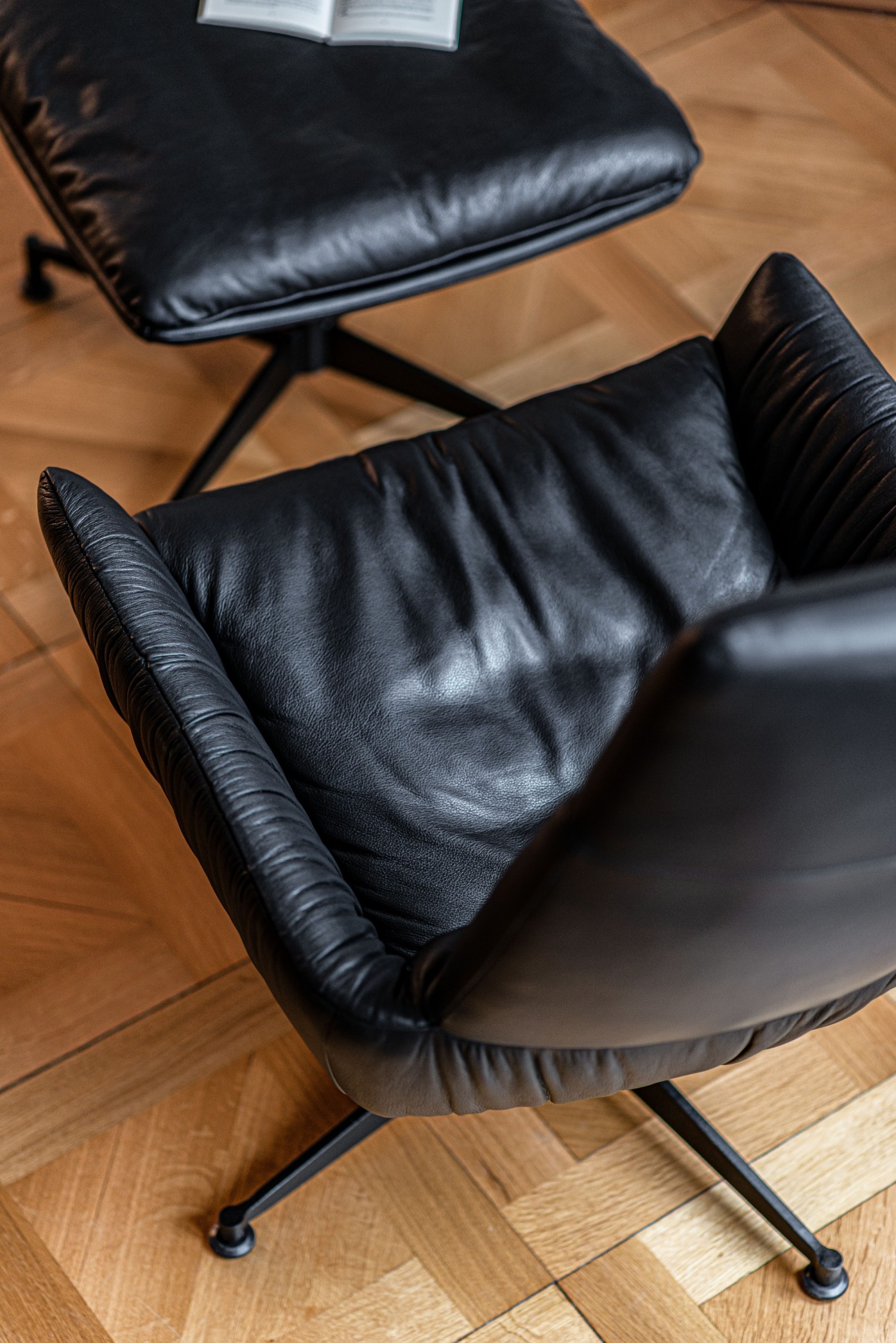 To match the armchair, KFF draws a casually upholstered, cuddly pouf that makes lounging even more comfortable. Material contrasts established by the individual upholstery of the armchair can be continued in the pouf.