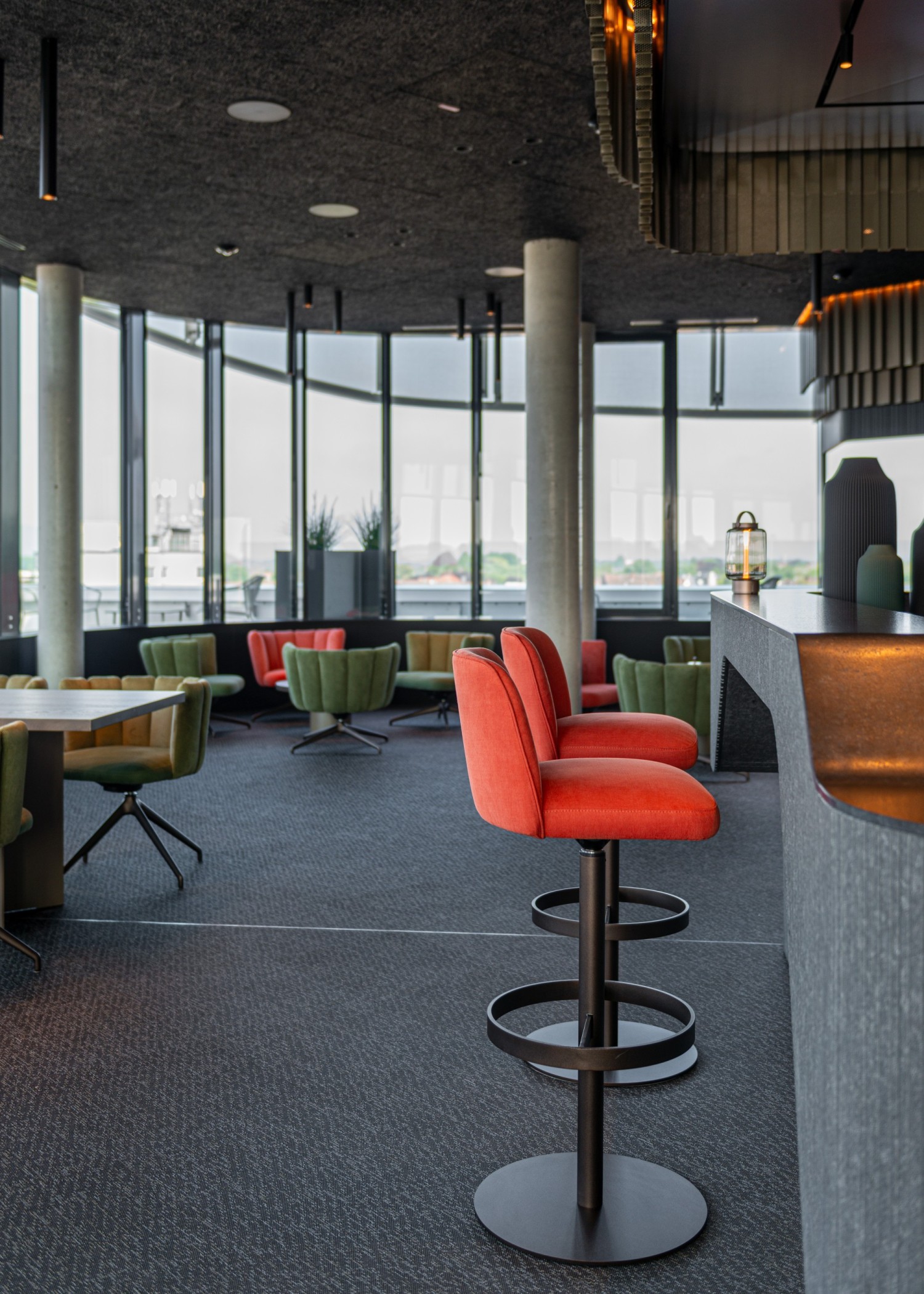 The Italian designer Monica Armani has skilfully transferred the design of the first GAIA model to the LINE Edition. Unmistakable seating comfort thanks to the ingenious upholstery of the generous seat and the closed semicircular backrest with elegant piping. The seat and piping are in identical colours, creating a contrasting or harmonious interplay. The most popular material mix is an exciting and individual combination of different materials. The GAIA LINE family includes three seat heights: lounging, dining and high-dining. The Italian designer has also created the GAIA table models for KFF partner company ASCO. The table columns pick up the upholstery fabric of the GAIA LINE chairs, creating a harmonious and unique ensemble.