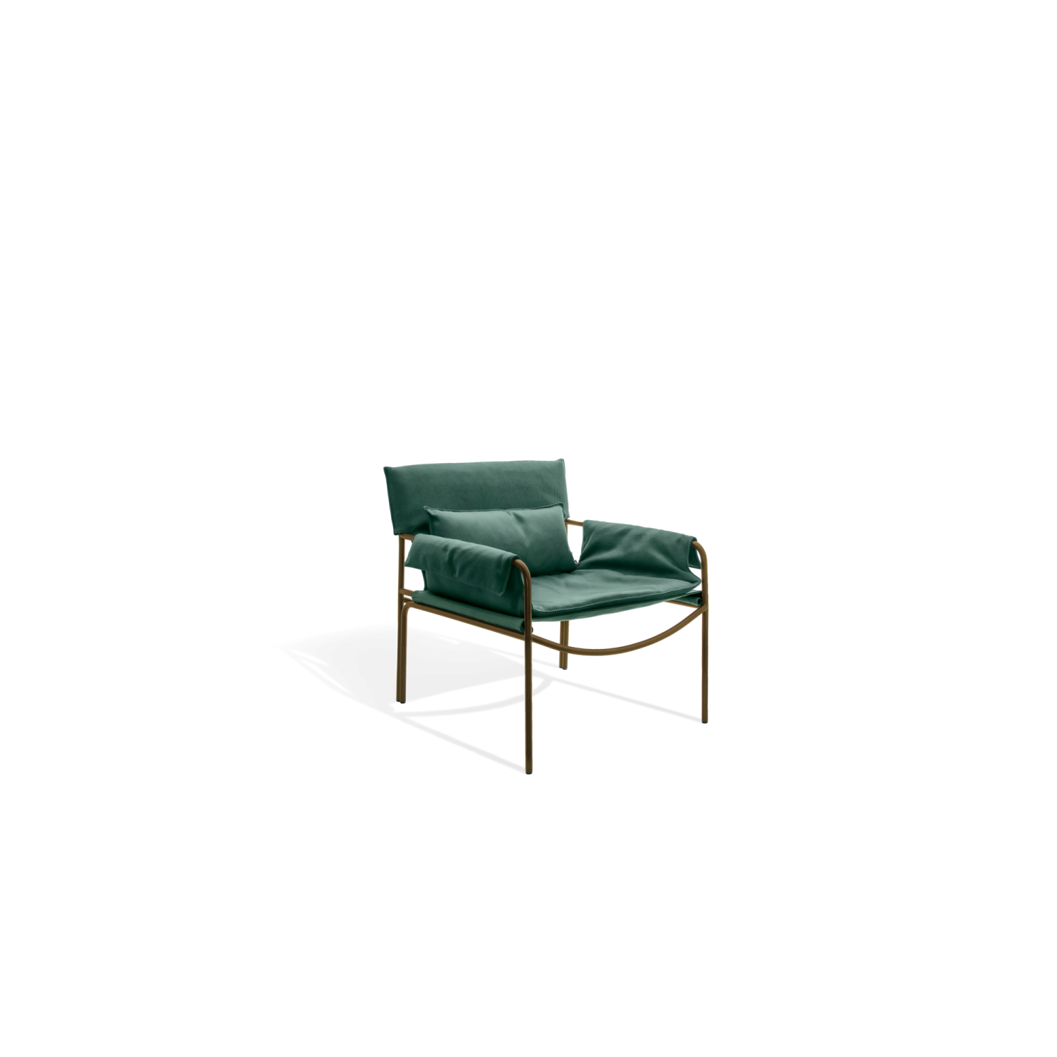 The minimalist LOOP family by newcomer Daniel Stegen has the look of a director's chair and is drawn in clear lines. An open, timeless design language characterises the seating furniture, as does the excellent quality of materials and workmanship. The double-layered fabric or leather upholstery in the back and seat areas offers maximum comfort. To meet the desire for even more cosiness and warmth, a small additional cushion can be selected or a soft upholstered cover can optionally be placed over the back and armrests. The chair model and the armchair with its convertible ottoman make a dignified ensemble as a family. The minimalist design seating furniture is placed in the outdoor area as a POOL family.